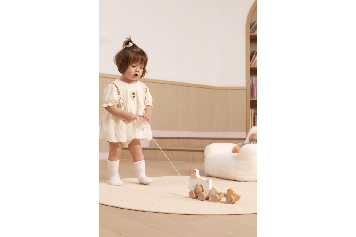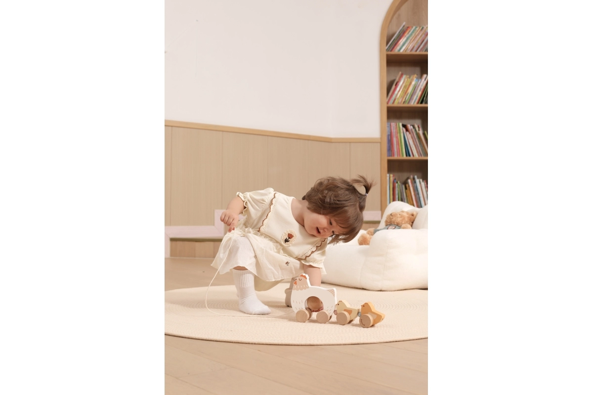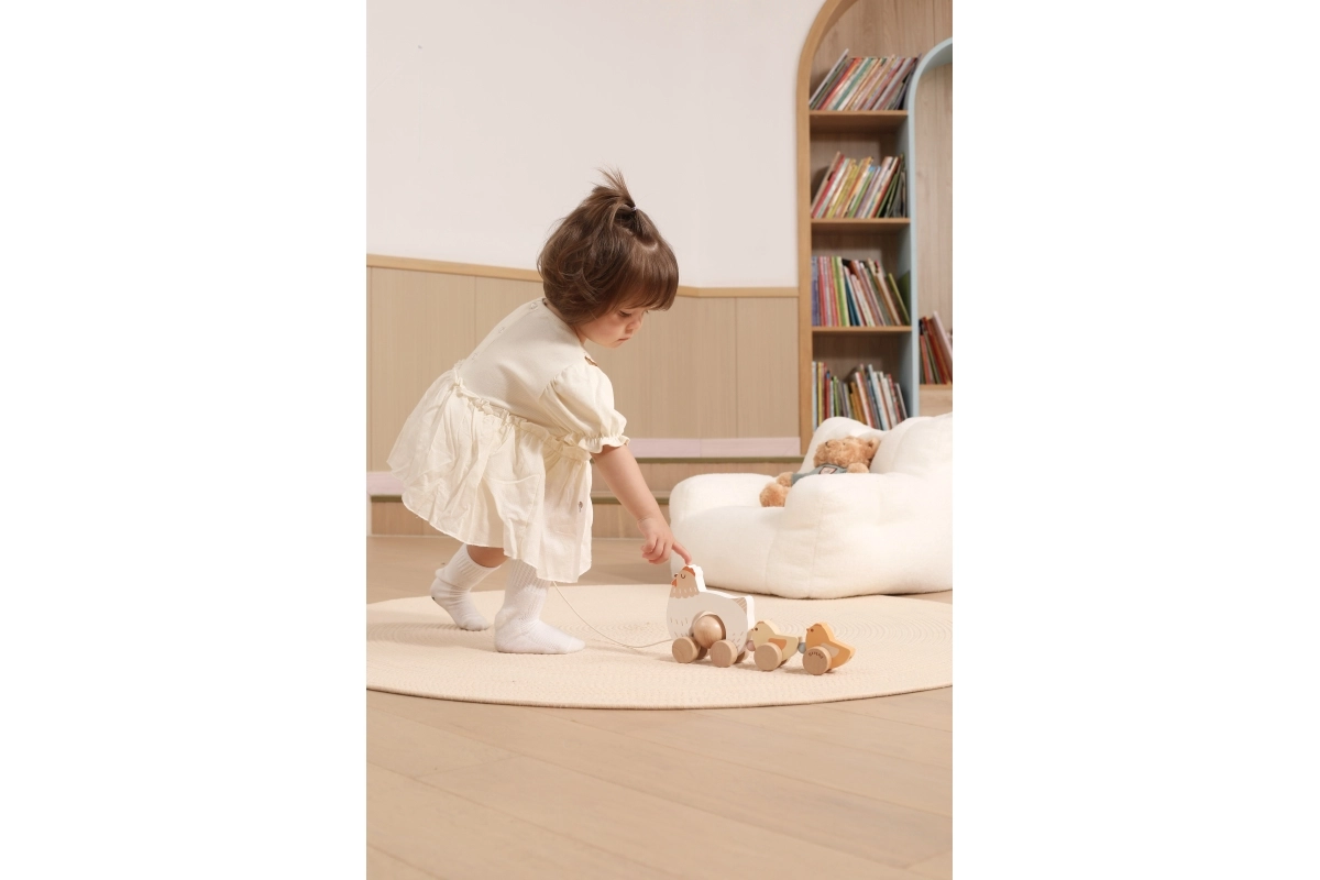 La tragere, puișorii se mișcă ritmic și îi îndeamnă pe copii la noi pași – distracție și antrenament al echilibrului într-un singur produs.
