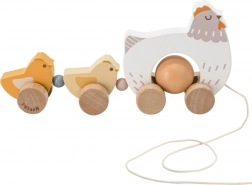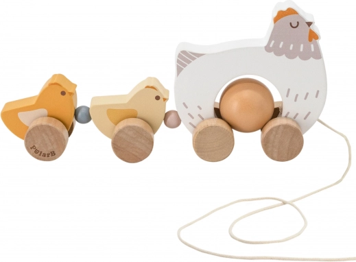 Găină de lemn cu pui de tras ;2 divertisment și învățare într-un singur joc! Acest accesoriu adorabil este companionul perfect pentru copiii care încep să meargă. Puii se leagănă vesel în mișcare, iar oul detașabil se rotește pentru distracție suplimentară. Jucăria nu doar distrează, ci susține și dezvoltarea coordonării și abilităților motorii ale copilului.