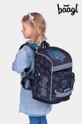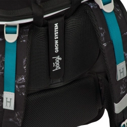 Spatele ghiozdanului se reglează ușor în trei mărimi, astfel încât se potrivește perfect încă din clasa I și susține postura sănătoasă datorită pernuțelor și ventilației.
