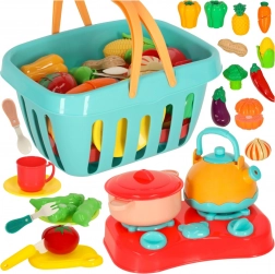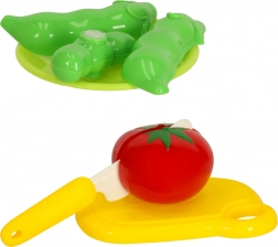 Acest set bogat le permite copiilor să „prepare” mâncăruri din fructe și legume colorate, împărțite în bucăți care se unesc cu arici. Joaca cu cuțitașele și accesoriile ajută la priza corectă, coordonarea mână–ochi și familiarizarea naturală cu denumirile alimentelor.