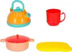 - Accesorii de bucătărie (15 buc): ceainic, oală cu capac, tacâmuri (cuțit mare și mic, linguriță, furculiță), cană, tocător, plită/jucărie de bucătărie pentru copii, coș.