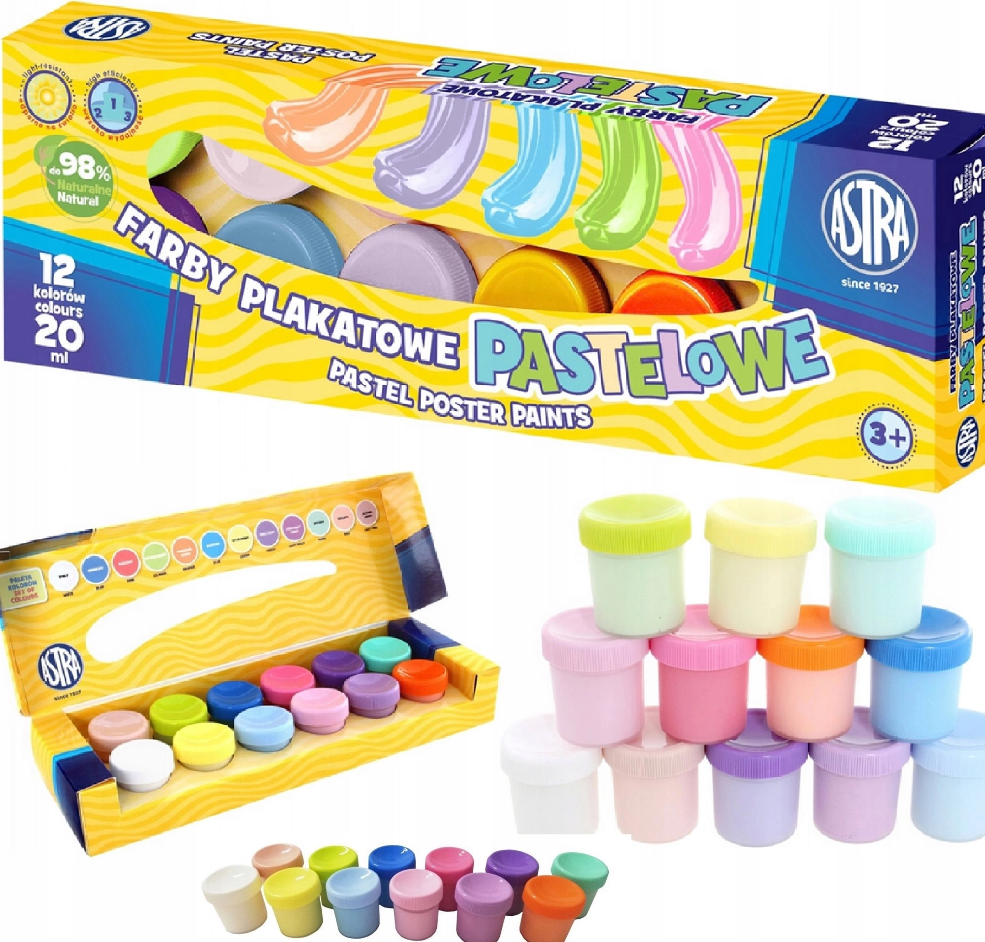 Temperalele pastel ASTRA 12×20 ml îi vor încânta atât pe copii, cât și pe creatorii începători, prin tonuri delicate și luminoase. Sunt diluabile cu apă, au putere mare de acoperire, lasă finisaj mat după uscare și sunt rezistente la lumină – ideale pentru activități școlare și creative acasă.
