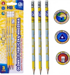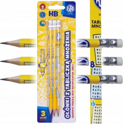 Set de trei creioane ASTRA cu duritate HB și imprimare practică cu tabla înmulțirii, care ușurează învățarea și scrisul. Oferă un corp ergonomic triunghiular pentru prindere confortabilă, o mină de 2,2 mm de calitate și o gumă la capăt. Lemnul provine din păduri gestionate responsabil.