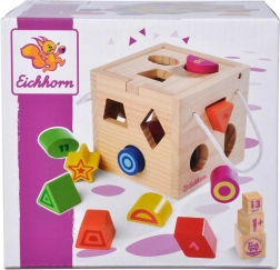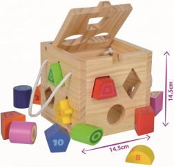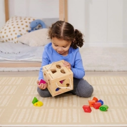 Acest cub din lemn cu deschidere oferă jocul clasic de recunoaștere a formelor. Copiii introduc piesele în deschiderile potrivite și exersează coordonarea mână–ochi, gândirea logică și concentrarea. Datorită culorilor vii, învățarea devine firesc distractivă.