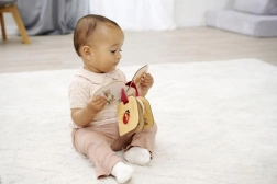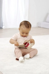 Inelul practic pentru prindere permite să luați cărticica în siguranță în călătorii și să o fixați pe cărucior sau în scaunul auto. Este produsă din lemn de tei 100% cu certificare FSC, îndeplinind cerințele pentru o jucărie de calitate și sustenabilă pentru cei mici de la 12 luni.