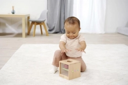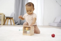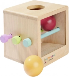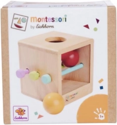 Cutia Montessori este o jucărie educativă din lemn, versatilă, realizată din 100% lemn de fag cu certificare FSC. Cutia cu vizor, 3 tije și 2 bile colorate permit setarea unei dificultăți variabile – cu tije bilele se opresc în interior, fără tije se rostogolesc imediat afară. Susține motricitatea fină, coordonarea mână–ochi și înțelegerea cauzei și efectului. Potrivită de la 1 an.