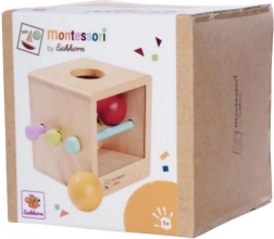 Cutia Montessori se bazează pe principiile pedagogiei Montessori: copilul aruncă bila în orificiu, îi observă mișcarea și învață concentrarea și răbdarea. Tijele introduse împiedică temporar trecerea, astfel cei mici experimentează ce se întâmplă după îndepărtarea lor. Fără tije, activitatea este mai ușoară și ideală pentru copiii mai mici.