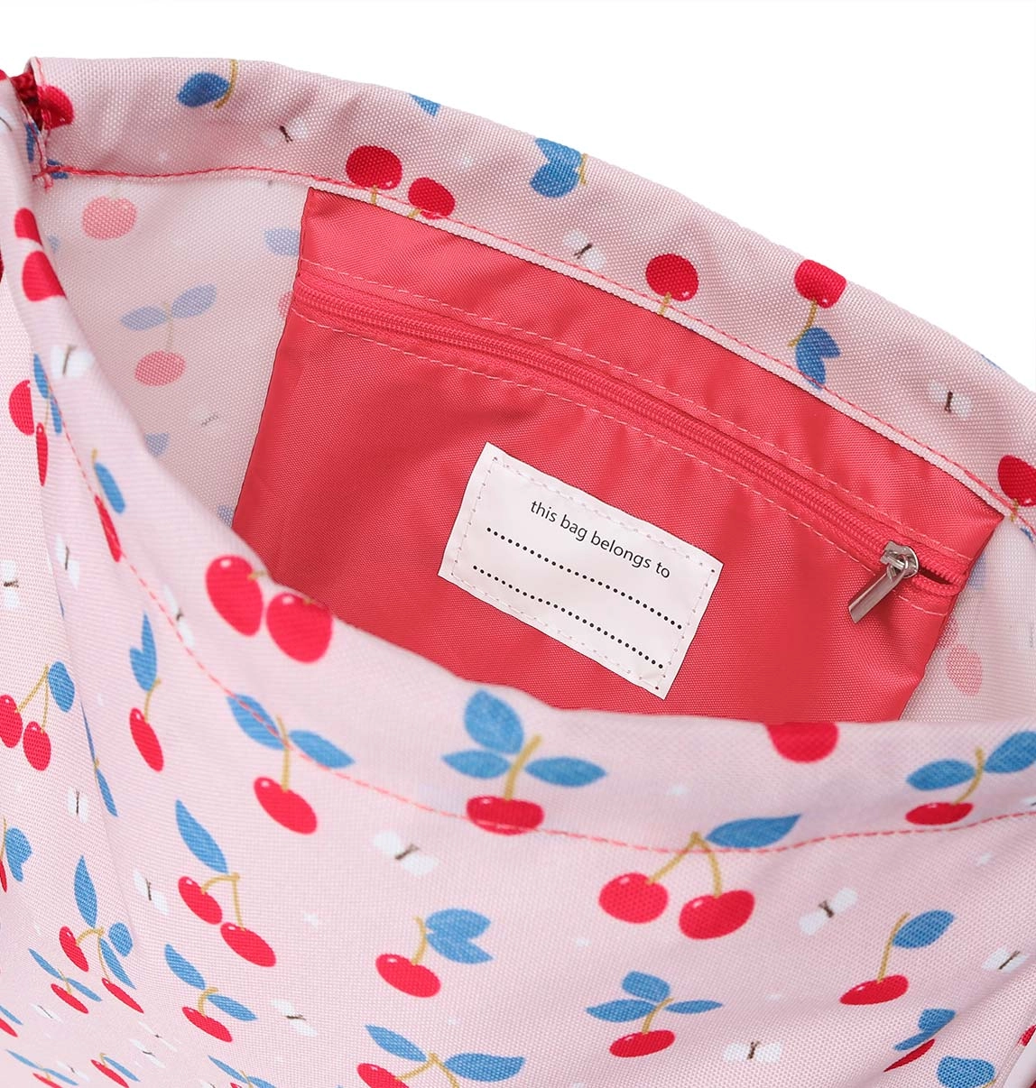 Rucsacul tip sac cu model de cireșe va fi un partener de încredere pentru școală, cluburi și înot. Este ușor, se poartă cu ușurință, iar copiii îl pot strânge și deschide fără efort. În interior găsiți un buzunar cu fermoar practic pentru chei, monede sau alte valori.