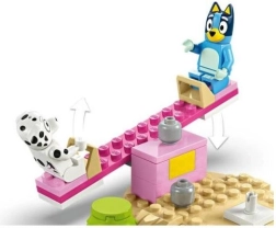 Acest set jucăuș cu tematică de teren de joacă oferă copiilor de la 4 ani o mulțime de posibilități pentru joacă liberă și construit. Două figurine – Bluey și Pătatul – se pot da pe toboganul galben, se pot legăna, se pot distra pe leagănul tip pârghie, se pot cățăra pe scară și pot observa împrejurimile din turnul cu telescoap. Nu lipsește nici platforma rotundă cu elemente de joc, mini-picnicul cu cești și brioșe și micile plante de sărit.