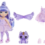 Descoperă păpușa magică Rainbow High surioara mică zână Amethyst în stil purpuriu. Vine cu un animăluț adorabil, căruia i se pot atașa aripi de zână, și cu păr lung ce poate fi pieptănat. Păpușa are picioare transparente cu tentă colorată asortate cu părul și un outfit complet pentru și mai multă distracție.