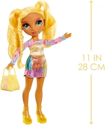 Sunny din RAINBOW HIGH este o muză a modei, încrezătoare, care îi inspiră pe copii să își exprime propria individualitate. Ținuta ei îmbină accente galbene strălucitoare și curcubeu – un top expresiv, o fustă atemporală, pantofi eleganți și o geantă asortată. Părul prins în pigtails jucăușe invită la creativitate în coafare.