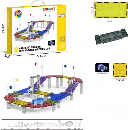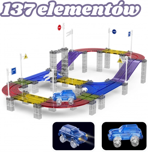 Woopie pistă de curse magnetică cu mașinuță LED, 137 piese. Îmbinare ușoară, trasee pe mai multe niveluri, efecte luminoase. Distracție creativă pentru copii de la 3 ani.