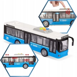 Descoperiți autobuzul urban WOOPIE, excelent realizat, la scara 1:16, care îi va încânta pe copii prin detalii și funcții autentice. Este suficient să apăsați unul dintre cele patru butoane de pe acoperiș și autobuzul sună ca unul adevărat: pornirea motorului, mers înainte, mers înapoi și claxon. Interiorul este iluminat, iar ușile se deschid și se închid manual cu ajutorul unui comutator rotativ practic.
