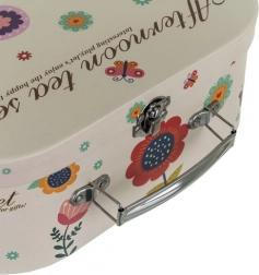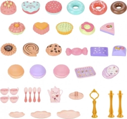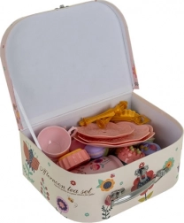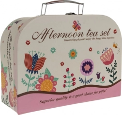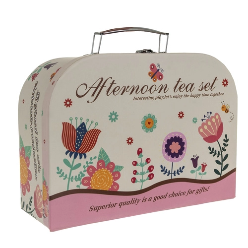 Conținutul pachetului: valiză cu mâner și închidere metalică, suport etajat cu trei niveluri pentru dulciuri, ceainic cu capac, 4 cești roz, 4 farfurioare cu motive florale, 4 lingurițe decorative, tavă de servire, 20 de dulciuri (bomboane, gogoși, macarons, biscuiți), cutie de transport maro.