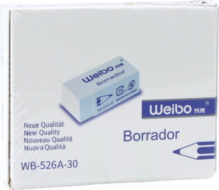 Gumă albă școlară și de birou WEIBO 4 × 2 × 1 cm. Ștergere curată fără dâre, fără latex, dimensiuni compacte și ambalaj în folie. Ideală pentru școală și birou.