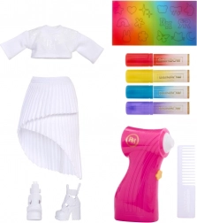 Setul include o păpușă stilată cu păr lung alb, corp articulat și o ținută complet albă, pregătită pentru colorare. Dă viață părului, rochiei și pantofilor și finisează detaliile direct cu markerul pentru decor precis. Cadoul ideal pentru copiii care iubesc moda, culorile și creația.