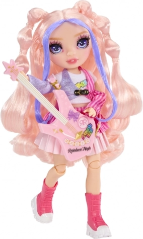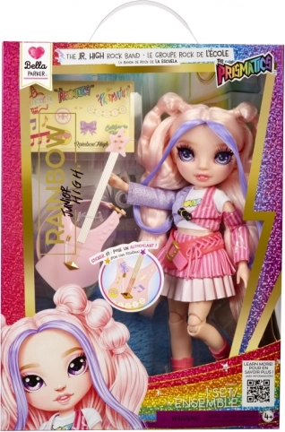 Descoperă farmecul anilor de școală cu păpușa Rainbow High Junior Bella, care face parte dintr-o trupă rock. Această păpușă de aproximativ 23 cm impresionează prin stilul roz, articulațiile mobile pentru poziționare ușoară și o chitară bas grozavă. Sunt incluse și autocolante pentru a-ți personaliza lookul și pentru nenumărate momente de joacă creativă.