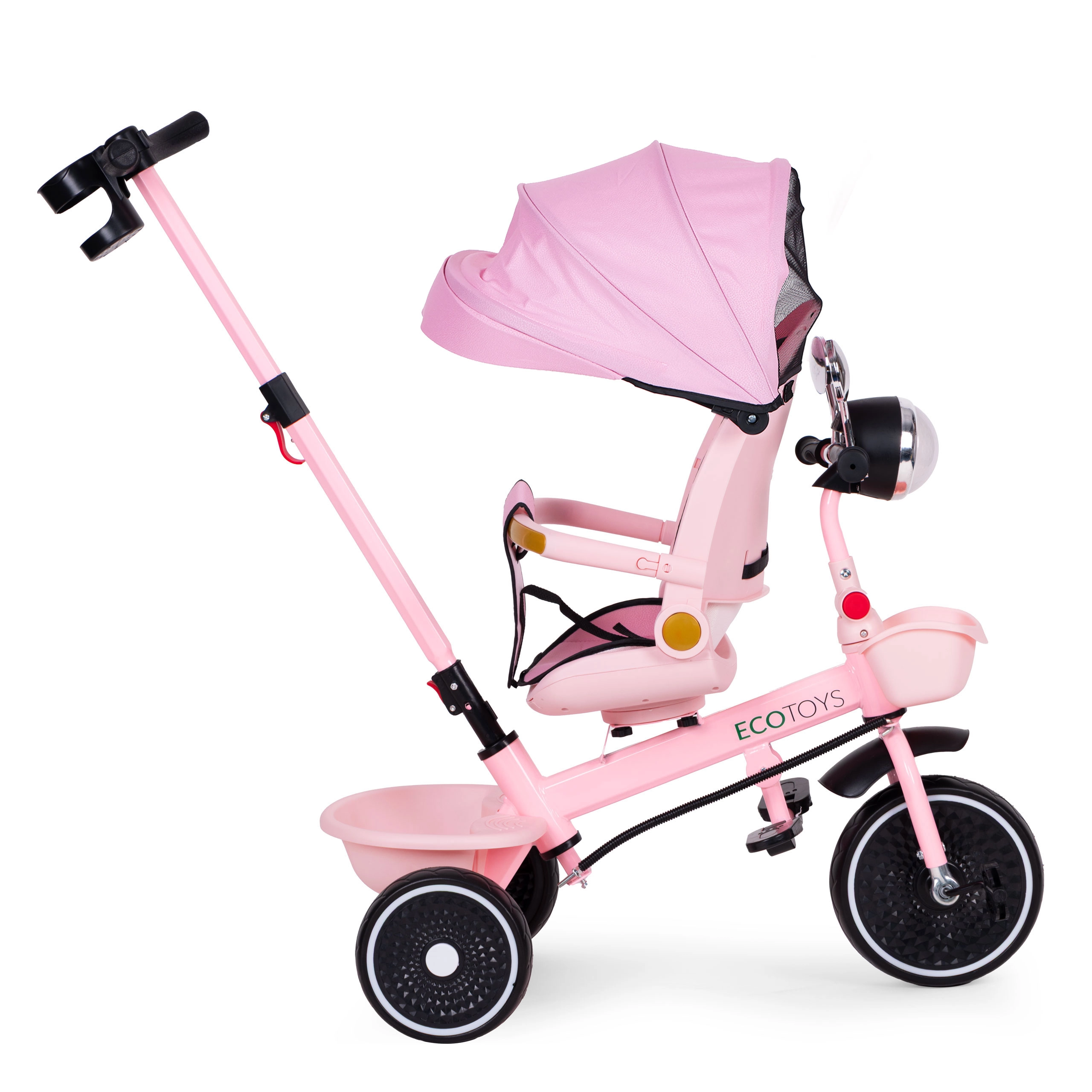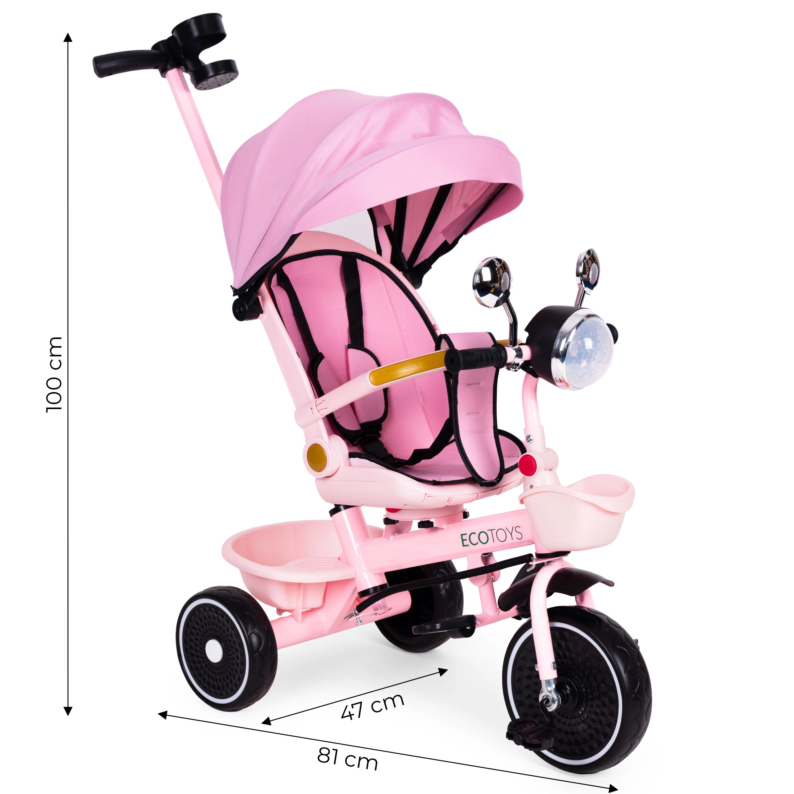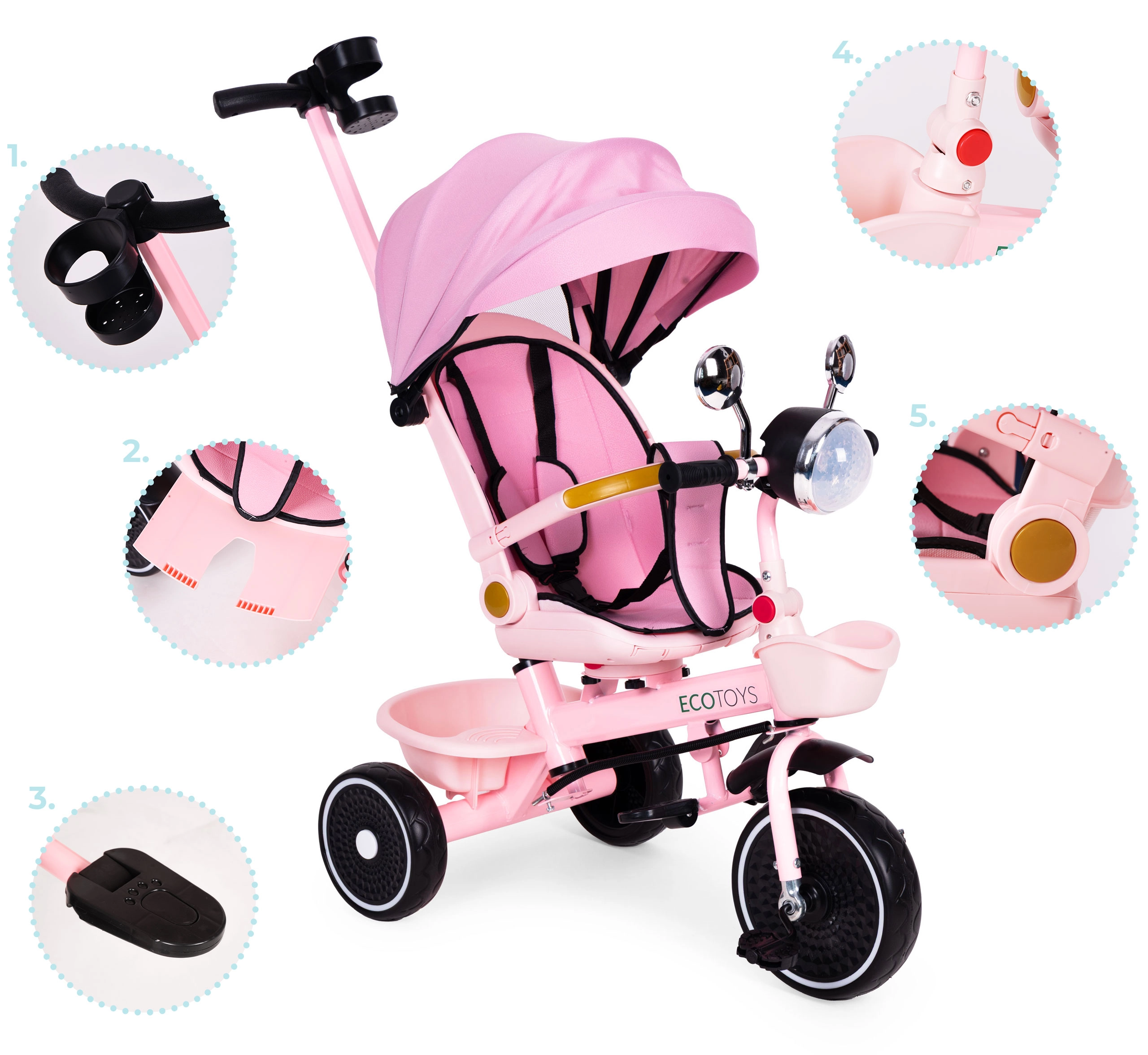 Tricicleta-cărucior ECOTOYS roz, stilată, combină confortul unui cărucior cu plăcerea mersului pe tricicletă. Oferă scaun rotativ 360°, bară de ghidare pentru părinți cu direcționarea roții din față, capotină rabatabilă, centură de siguranță în 5 puncte și roți din EVA durabile pentru o plimbare lină și sigură de la 6 luni până la 6 ani.
