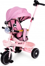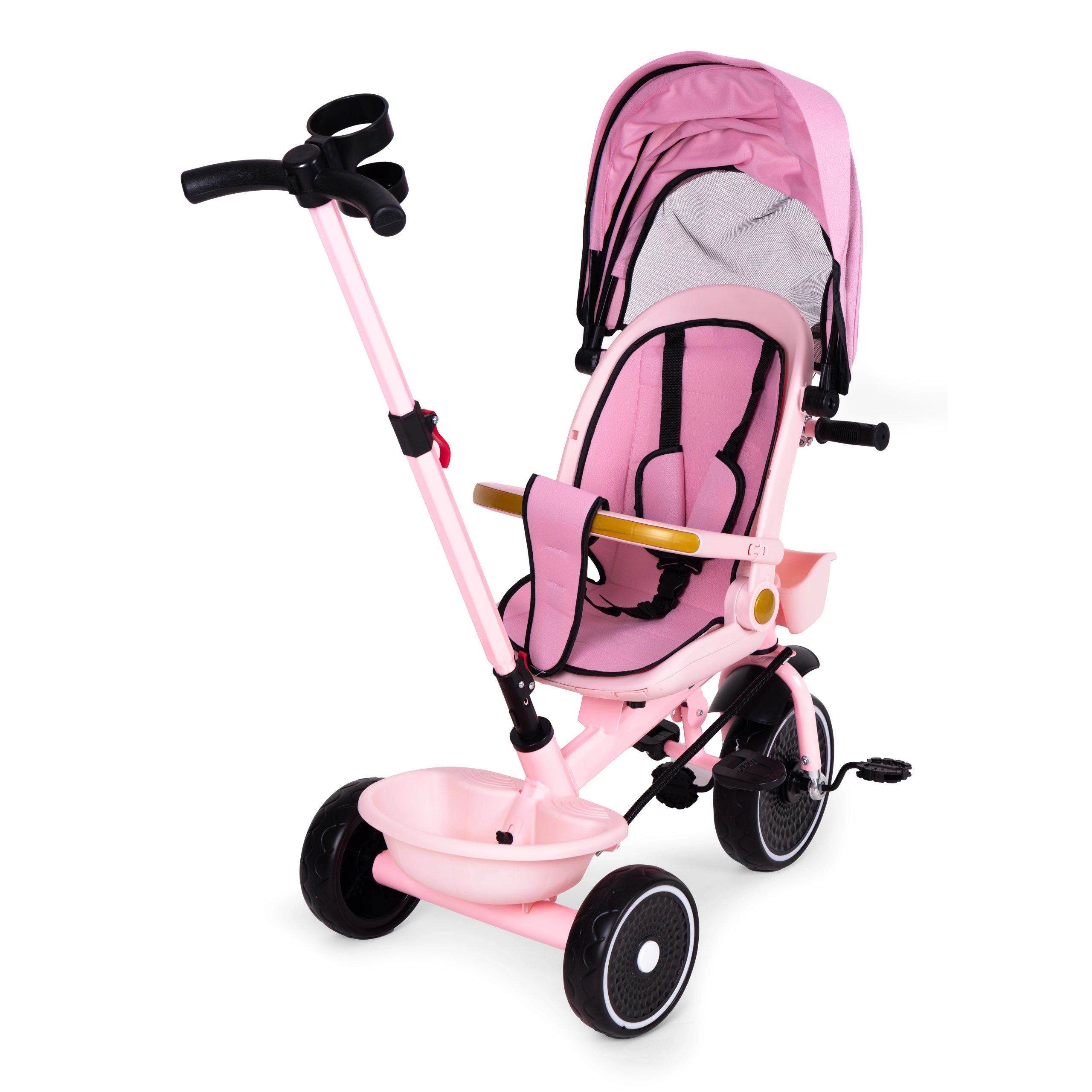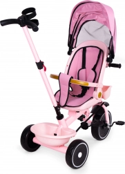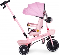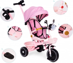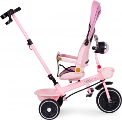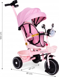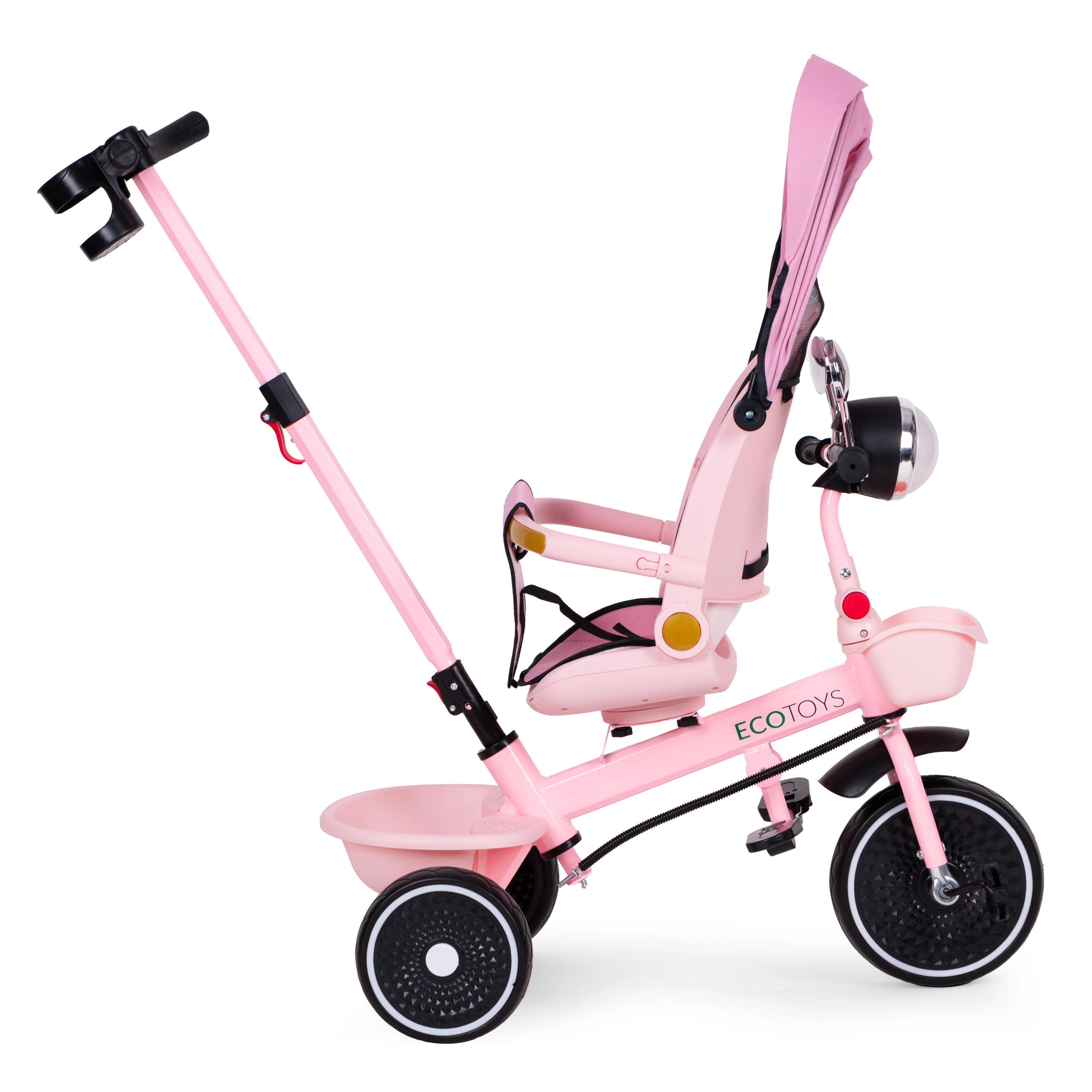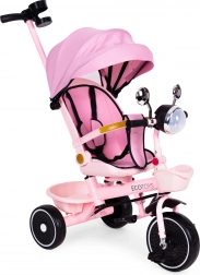 Tricicleta-cărucior ECOTOYS roz, stilată, combină confortul unui cărucior cu plăcerea mersului pe tricicletă. Oferă scaun rotativ 360°, bară de ghidare pentru părinți cu direcționarea roții din față, capotină rabatabilă, centură de siguranță în 5 puncte și roți din EVA durabile pentru o plimbare lină și sigură de la 6 luni până la 6 ani.