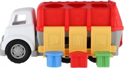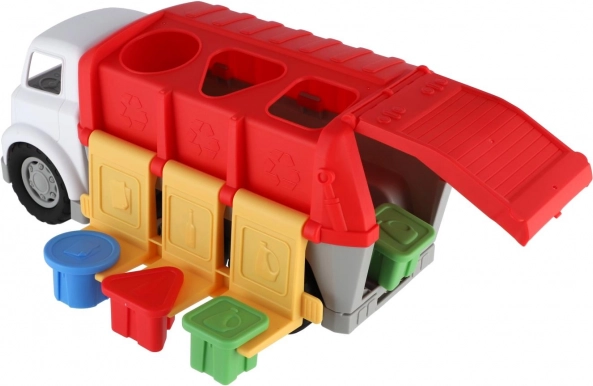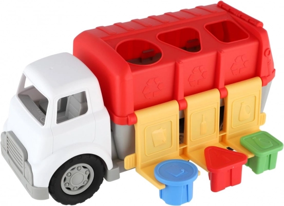 Acest camion colorat de gunoi îi va încânta pe micii iubitori ai curățeniei și reciclării. Partea superioară servește ca sortator de forme cu orificii în care copiii potrivesc piesele corecte și învață astfel să recunoască formele și culorile. Ușile laterale care se deschid și coșurile detașabile permit o imitație distractivă a colectării deșeurilor.