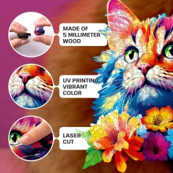 Acest puzzle premium din lemn cu motiv de pisică îmbină măiestria de calitate cu un demers ecologic responsabil. Datorită lemnului de 5 mm este stabil și plăcut la atingere, iar tăierea cu laser asigură margini netede și o potrivire perfectă a pieselor. Imprimarea UV modernă oferă culori intense și o imagine detaliată, care se evidențiază chiar și ca decorațiune de perete.