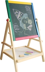 Această tablă din lemn, cu două fețe și multifuncțională, este un ajutor excelent pentru joaca și învățarea zilnică. Copiii pot exersa scrisul, desenul și primele calcule pe partea albă magnetică pentru scriere uscată sau pot crea cu cretă pe suprafața neagră tradițională. Datorită poliței spațioase, toate accesoriile sunt mereu la îndemână.