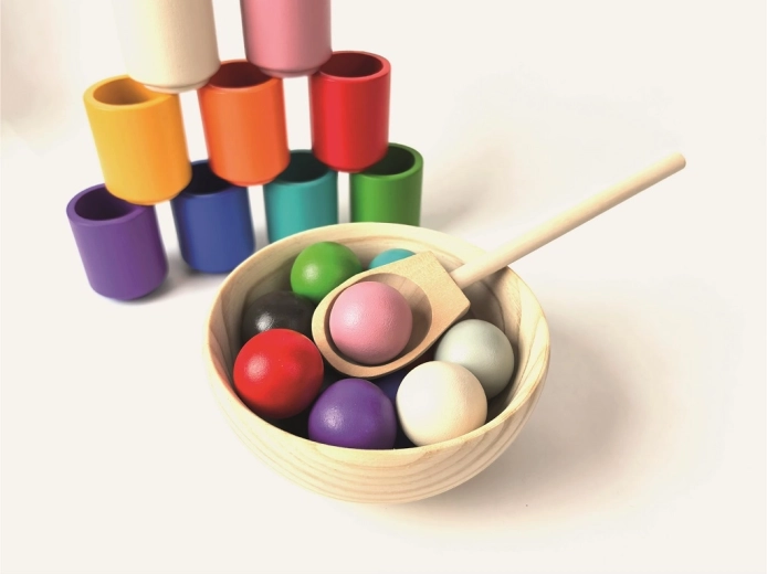 Setul include un bol, o lingură, bile și cupe în 12 culori ale curcubeului. Datorită calității execuției din lemn certificat FSC, jucăria este durabilă, sigură și plăcută la atingere. Excelentă pentru acasă și pentru grădinițe.