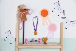 Descoperă distracția cu hobby horsing pentru păpușile tale BABY born! Acest set include un căluț pe băț cu cap moale din pluș, accesorii grozave pentru antrenament și concursuri și motivație sub forma unei medalii și a unei cupe. Ideal pentru păpuși de 36 cm și 43 cm și perfect pentru dezvoltarea imaginației și a jocului activ.