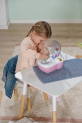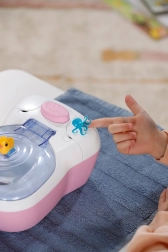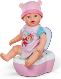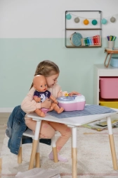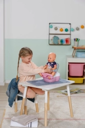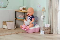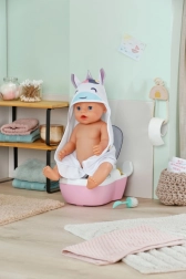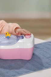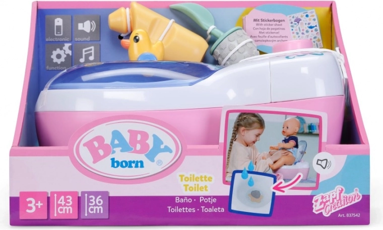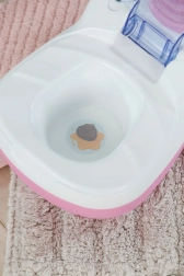Toaleta interactivă BABY born transformă îngrijirea zilnică a păpușii într-un ritual distractiv. De îndată ce păpușa se așază pe colac, se aud sunete realiste de stropire, iar dacă rămâne așezată mai mult, pornește o melodie haioasă și apoi sunetul de golire/tragere a apei. Toate acestea îi motivează pe copii să exerseze jucăuș obiceiurile de igienă.