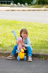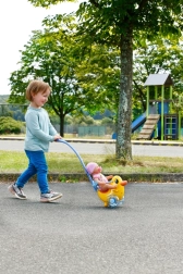 Împingătorul Berta este accesoriul ideal pentru micii îngrijitori. Datorită bării de ghidare detașabile și ajustabile, se adaptează ușor înălțimii copilului și oferă o manevrare confortabilă. Spătarul reglabil și mânerul de fixare asigură că pe scăunel încape comod orice păpușă BABY BORN.