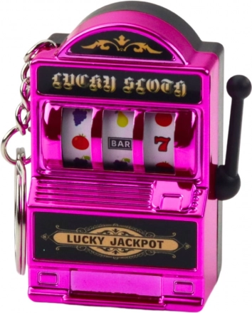 Mini breloc pentru chei în formă de automat de sloturi, cu manetă mobilă. Compact 6×4×2,5 cm, mix de culori. Cadou original și gadget amuzant.