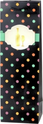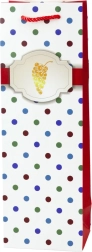 Datorită dimensiunilor de 35 × 12 × 9 cm, punga este perfect adaptată pentru sticle și alte cadouri înalte. Este disponibilă într-un mix de modele (alb și negru cu buline colorate) cu motiv de sticlă și pahar sau ciorchine de struguri. Se vinde la bucată; motivul este ales aleatoriu.
