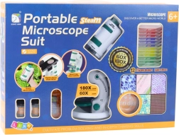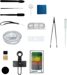- Mini microscop, stativ reglabil cu LED, curea de mână, lupă, suport pentru telefon, 2× sticluță pentru probe, incubator triplu cu lamele, recipient pentru preparat cu lamelă, pipetă, cuțitaș, spatulă, bețișor, pensetă, 12 preparate gata făcute, 4 lamele goale, ambalaj colorat