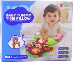 Pernă de susținere pentru bebeluși, concepută pentru a sprijini dezvoltarea corectă încă din primele zile de viață. Forma ergonomică facilitează poziția pe burtică, întărind în mod natural mușchii și pregătind copilul pentru etapele următoare, precum statul în șezut sau târâtul. Materialele moi și plăcute, împreună cu culorile contrastante, stimulează văzul, auzul și simțul tactil.