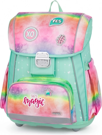 Datorită unui singur compartiment spațios, toate rechizitele pentru clasele 1–2 încap cu ușurință. Buzunărașul frontal este ideal pentru gustare și mărunțișuri. Siguranța este sporită de catarama metalică cu element reflectorizant și de numeroasele elemente reflectorizante care îmbunătățesc vizibilitatea copilului pe înserat și în condiții de vizibilitate redusă.