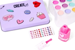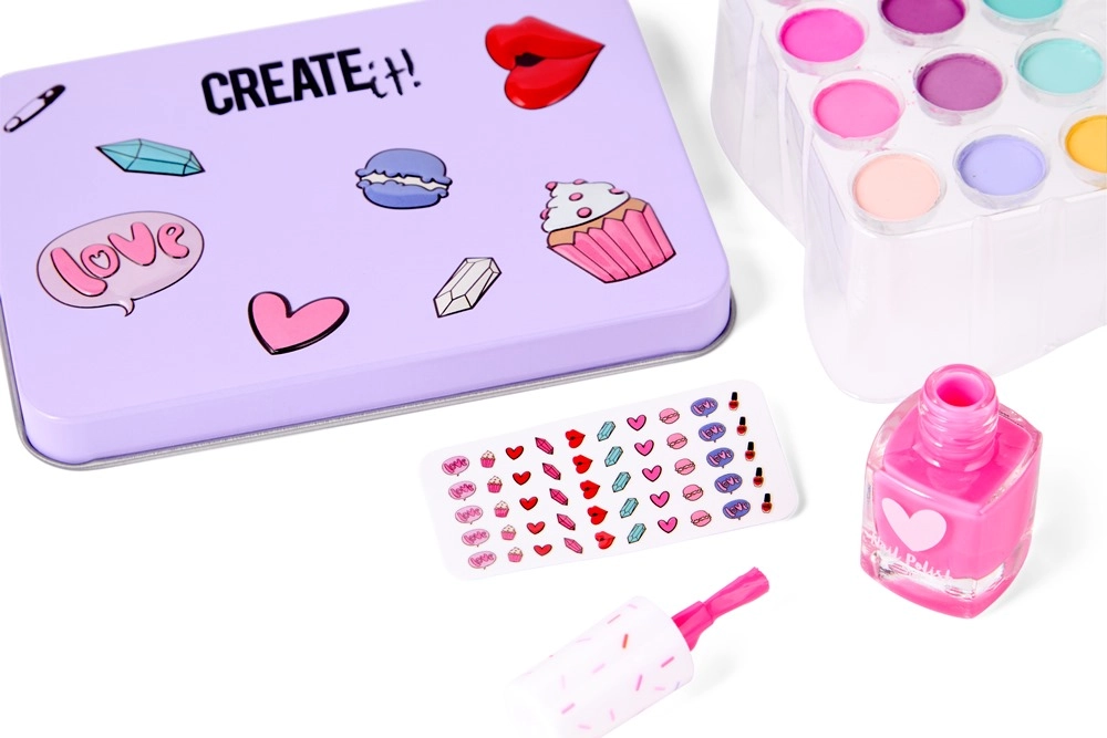 Acest set cosmetic pentru copii oferă o modalitate sigură și distractivă de a explora lumea machiajului. Datorită culorilor variate ale fardurilor și lacurilor, copiii pot crea nenumărate combinații și își pot dezvolta simțul estetic. Cutia metalică protejează conținutul și servește totodată ca o cutie de depozitare practică și elegantă.