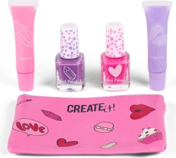 Set de machiaj stilat cu trusă cosmetică, ideal pentru tinerele domnișoare care doresc să descopere în siguranță lumea machiajului. Conține 2 luciuri de buze (6,2 ml), 2 lacuri de unghii (5 ml) și o trusă cosmetică practică pentru depozitare ușoară. Produsele sunt adaptate pielii delicate a copiilor, se aplică ușor și, datorită dimensiunilor compacte, sunt excelente atât acasă, cât și în călătorii.