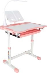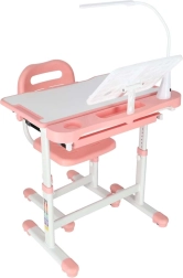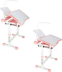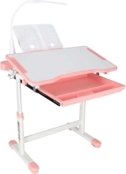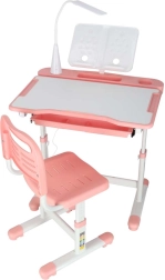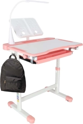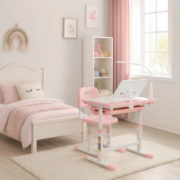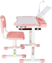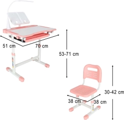 Set practic de birou pentru copii, în nuanțe de roz deschis, cu structură ajustabilă pe măsură ce copilul crește atât la birou, cât și la scaun, blat înclinabil până la 55°, sertar spațios culisant cu compartimente și lămpiță LED alimentată prin USB cu 3 moduri de lumină și 3 niveluri de luminozitate. Include suport pentru carte, cârlig pentru rucsac și suport pentru băutură pentru ordine și confort la învățat și activități creative.