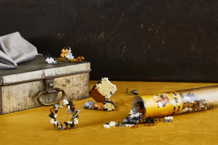Setul Plus-Plus Comoară include 100 de piese originale în culorile auriu, argintiu, cupru, negru și sidefat. Forma unică a pieselor permite construirea ușoară de mozaicuri 2D și modele 3D – de la idei simple până la construcții elaborate. Tubul practic este excelent pentru călătorii, grădiniță și acasă.