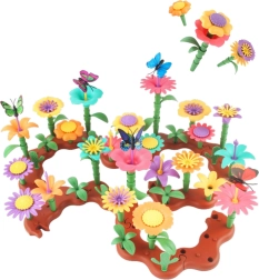 Acest set floral oferă o gamă bogată de forme și culori pentru a crea compoziții variate. Copiii pot combina corole, petale, stamine, frunze și baze pentru a proiecta mereu noi grădini, straturi de flori și scene de poveste. Îmbinarea simplă susține autonomia și bucuria creației.