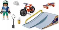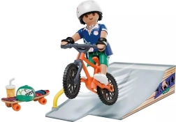 Descoperă distracția plină de acțiune cu setul PLAYMOBIL – skateboarder cu rampă. În pachet găsești tot ce ai nevoie pentru trucuri captivante și joacă creativă: rampă, figurină, skateboard și bicicletă BMX, plus accesorii precum șapcă, cască, MP3 și băutură.