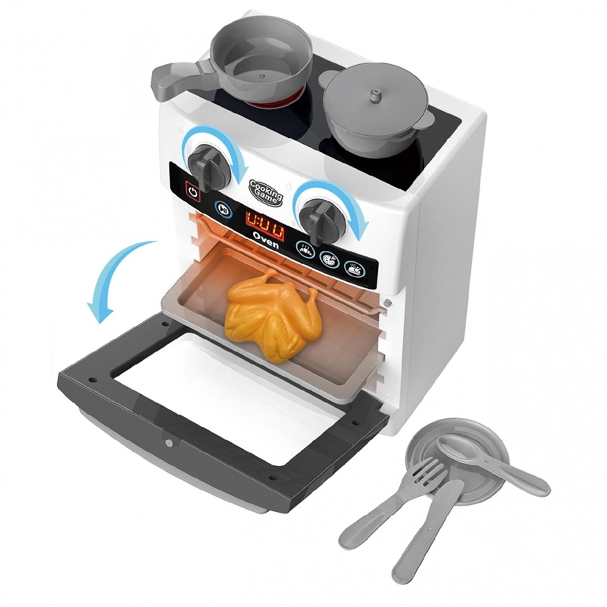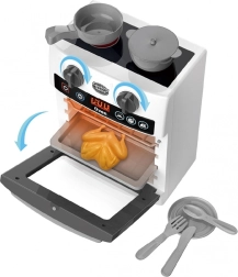Descoperă bucătăria pentru copii cu cuptor, care se luminează și redă sunete realiste ca aparatele adevărate. Este suficient să apeși butonul ON, să alegi unul dintre cele trei moduri și joaca poate începe – cuptorul se aprinde, iar bucătăria redă efecte sonore autentice. Două arzătoare și două butoane rotative cu clic amplifică senzația de gătit real. Include accesorii bogate pentru a crea „preparate delicioase”.