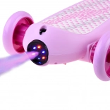 Această trotinetă electrică pentru copii îmbină un spectacol vizual grozav cu un control simplu și o construcție stabilă cu trei roți. Efectele luminoase DISCO luminează platforma și partea frontală, acompaniamentul muzical creează o atmosferă minunată, iar efectul de ceață din abur din spate îi va încânta pe toți copiii.
