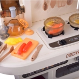 O bucătărie mare din plastic pentru copii, în nuanțe fine de bej, transformă orice cameră de copil într-un studio culinar. Oferă efecte de lumină și sunet, un aragaz cu abur realist, ușițe de cuptor și dulapuri care se deschid, baterie funcțională cu pompare și accesorii bogate pentru un joc de-a bucătarul fantastic.