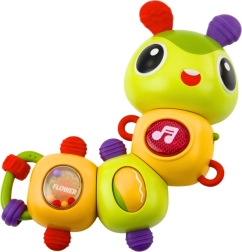 Adorabila omidă interactivă pentru copii de la 18 luni oferă efecte LED luminoase, melodii vesele și elemente rotative 360°, care stimulează curiozitatea și motricitatea fină. Datorită texturilor variate și proeminențelor din cauciuc moi, servește și ca inel gingival calmant în timpul erupției dentare. Mărgelele colorate, zornăitoarea și „oușorul” agil motivează copilul să exploreze și dezvoltă coordonarea mână–ochi.