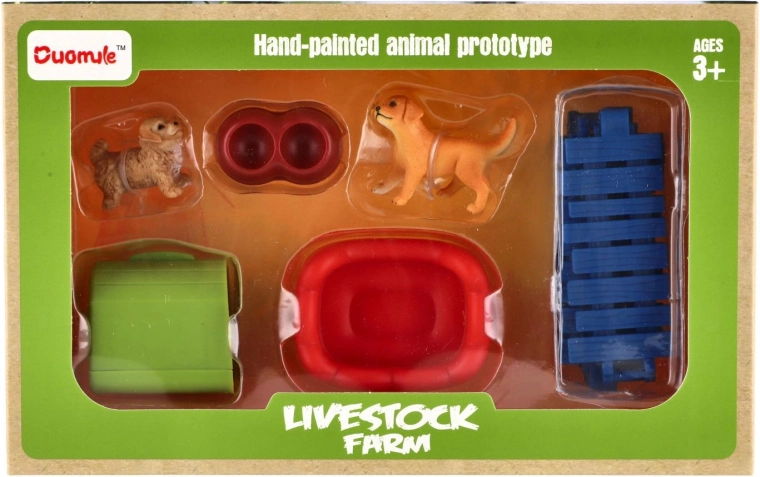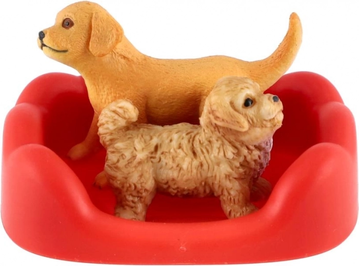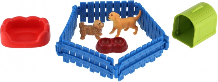 Acest set de joacă include două figurine de căţeluşi cu detalii realiste, un gard pentru crearea unui ţarc şi accesorii practice, precum bol sau culcuş. Copiii îşi pot crea propria lume şi pot exersa îngrijirea animalelor.