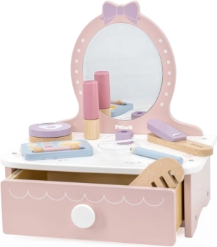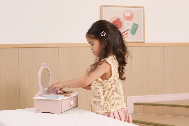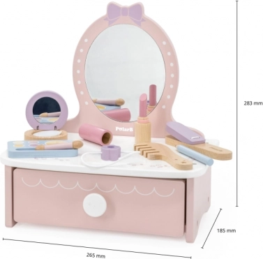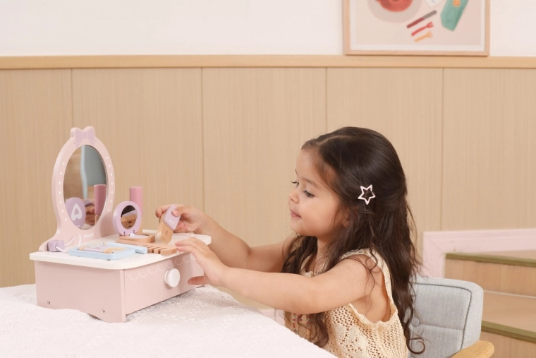 O toaletă stilată pentru copii, din lemn, oferă ore întregi de distracție creativă. Include măsuță și accesorii sigure din lemn precum pieptăn, ondulator și machiaj. Ideală pentru copii de la 3 ani. Construcție durabilă din lemn, accesorii bogate și dimensiuni compacte pentru amplasare ușoară în camera copilului.