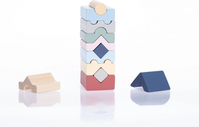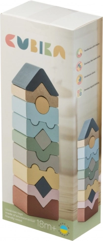 Turnul Pastel XI de la Cubika este un puzzle din lemn bine gândit, cu 12 piese în nuanțe pastel delicate. Copiii înșiră și așază piesele astfel încât să se potrivească corect și să rezulte un turn stabil cu înălțimea de 16 cm. Datorită finisării precise a lemnului, jucăria este plăcută la atingere și sigură pentru mâinile mici ale copiilor.