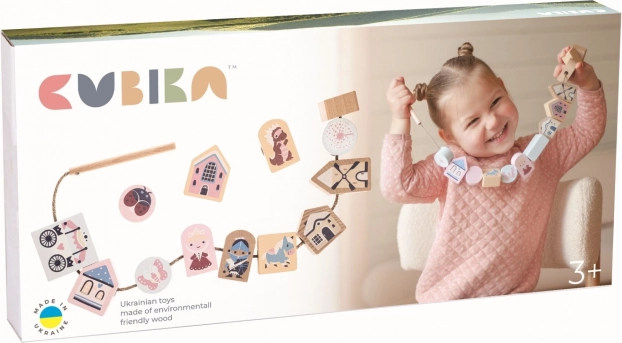 Povestea de înșirat CUBIKA Pastel este un set creativ pentru copiii care adoră să creeze și să exploreze. Datorită celor 12 piese din lemn cu motive de basm și celor 8 șabloane, copiii își antrenează memoria, coordonarea mână–ochi și concentrarea. Șnurul cu bastonaș din lemn ușurează înșirarea și le oferă copiilor bucuria creației proprii.