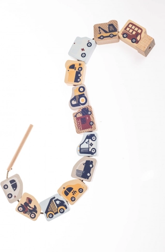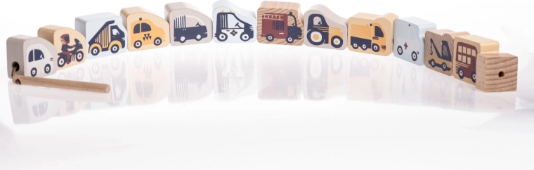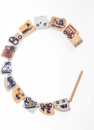 - Conținutul setului: piese din lemn cu motive de transport, șiret cu ac și opritor, carduri-model
